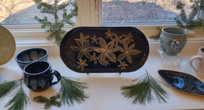The fine ceramic works of Lila Balch, Martha Martin, and Cathy Rees are on display and on sale at the library for the rest of December. Cups, vases, bowls, plates and more reflect the inspiration these artists take from the flora and fauna of the Maine coast. Their pieces are playful, elegant, and functional–displayed beautifully against the winter scene of the library’s back window. If you have lived in the area for a few years, perhaps you’ve seen their work displayed in Decembers past. Stop by again this year for insights into these three artists’ evolutions, how each of their practices has changed and grown while the art expands on the core visions of in which their careers are rooted. Pieces from these three artists make excellent gifts for friends and family who also find inspiration in the beauty of the area.